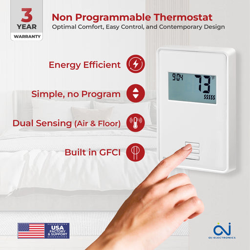 The OJ Microline thermostat can be programmed to control Floor Temperature, Room Temperature, or Room Temperature with Floor Temperature Limiting, providing optimal comfort while keeping floor coverings from exceeding specified temperatures.